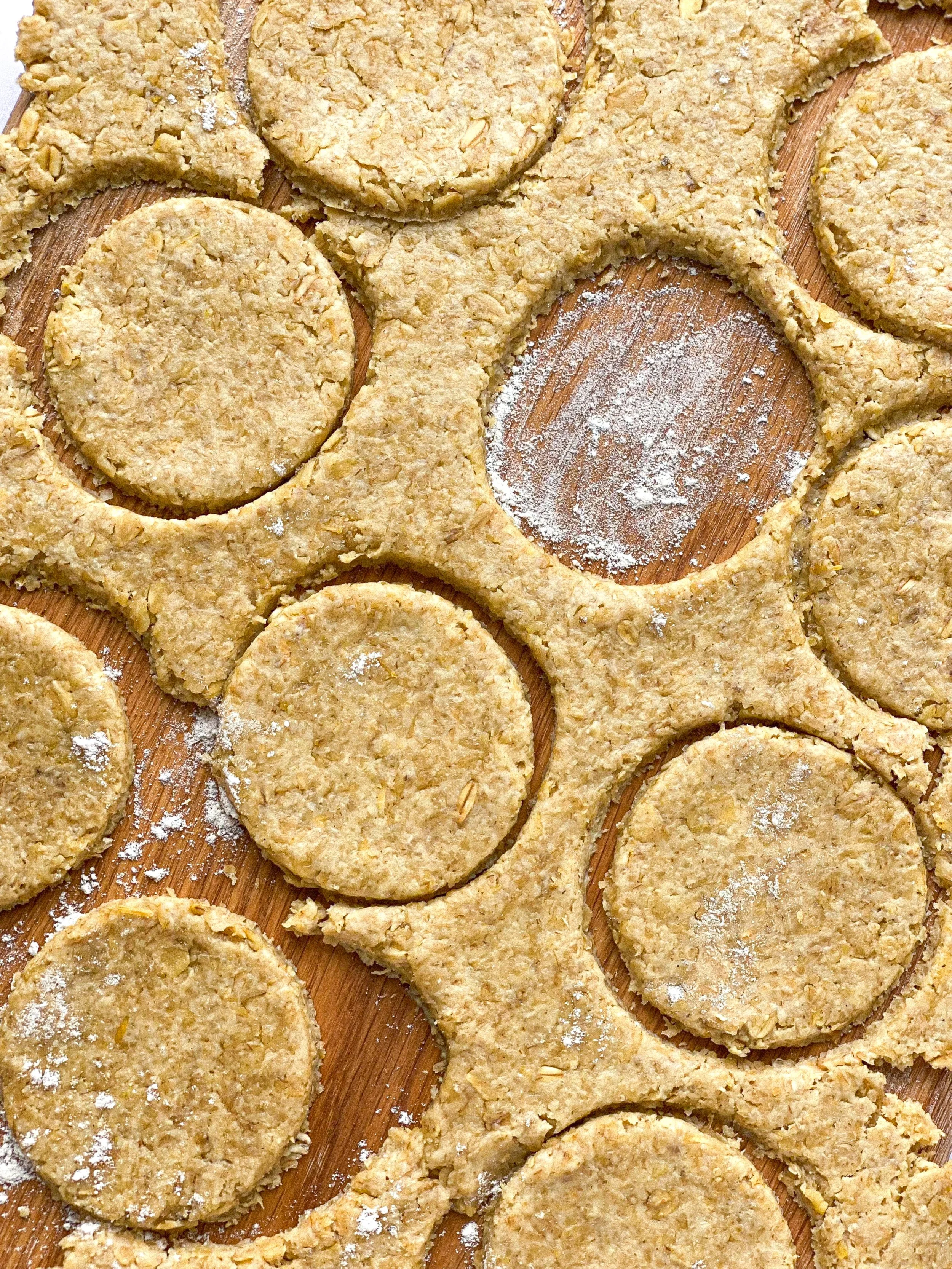 2) Heat the oven to 180c and line a baking tray with parchment paper. Uncover the dough and work it into a ball (It will be sticky at first). Dust a clean surface with gf/ oat flour and roll out the dough into about 1/2cm thickness. Use a glass or a cookie cutter to cut out the oat cakes, and place them on the lined tray. Take the remanning dough, shape it into a ball and repeat the process until you’re out of dough.